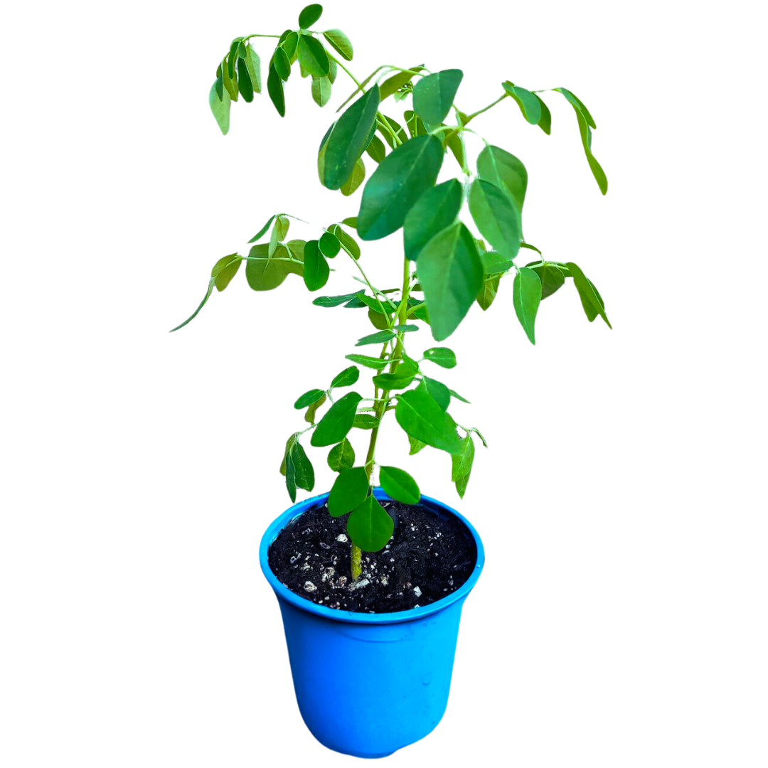 A young Dwarf Moringa Tree (Moringa oleifera) in a blue pot against a white background.