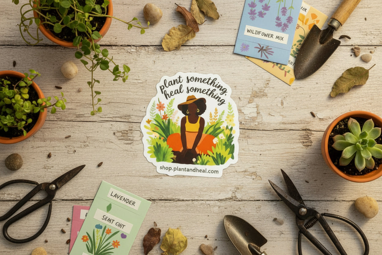 A grounded, soulful illustration of a Black woman kneeling in the garden, hands in the soil, surrounded by thriving greenery. This sticker centers restoration — of land, body, and spirit — through intentional planting.