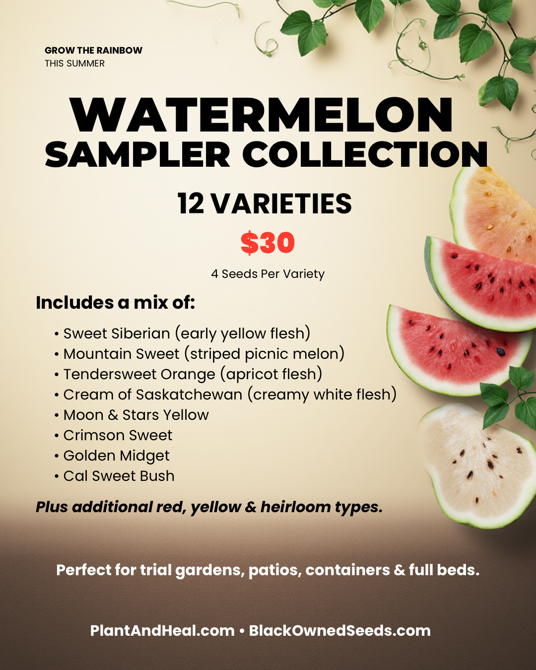 This sampler includes 12 distinct watermelon varieties, giving you color range, size variation, and staggered harvest timing — all in one curated collection. Instead of committing to full packs of multiple types, you get enough seed to test, compare, and discover what actually performs best in your soil.